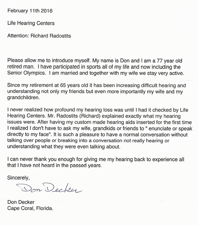 Dear Mr. Radostits, On behalf of my mother T. Franklin, my sister, D. Dennis, and our entire family, I want to commend and thank you. Michelle Pelley, all the staff of the Life Hearing Health Centers and the Kleindl Family for the gift of free hearing aids to mom. This generous gift has improved mom’s quality of life immensely. She is an active centenarian at age 102. She is now able to participate more fully in activities around her. The cost of hearing aids was prohibitive to her and this gift was a blessing. Your kindness, professionalism and generosity was overwhelming to us. The people of Southwest Florida are lucky to have such a philanthropic business. If ever you need a testimonial, please do not hesitate to call. Sincerely,